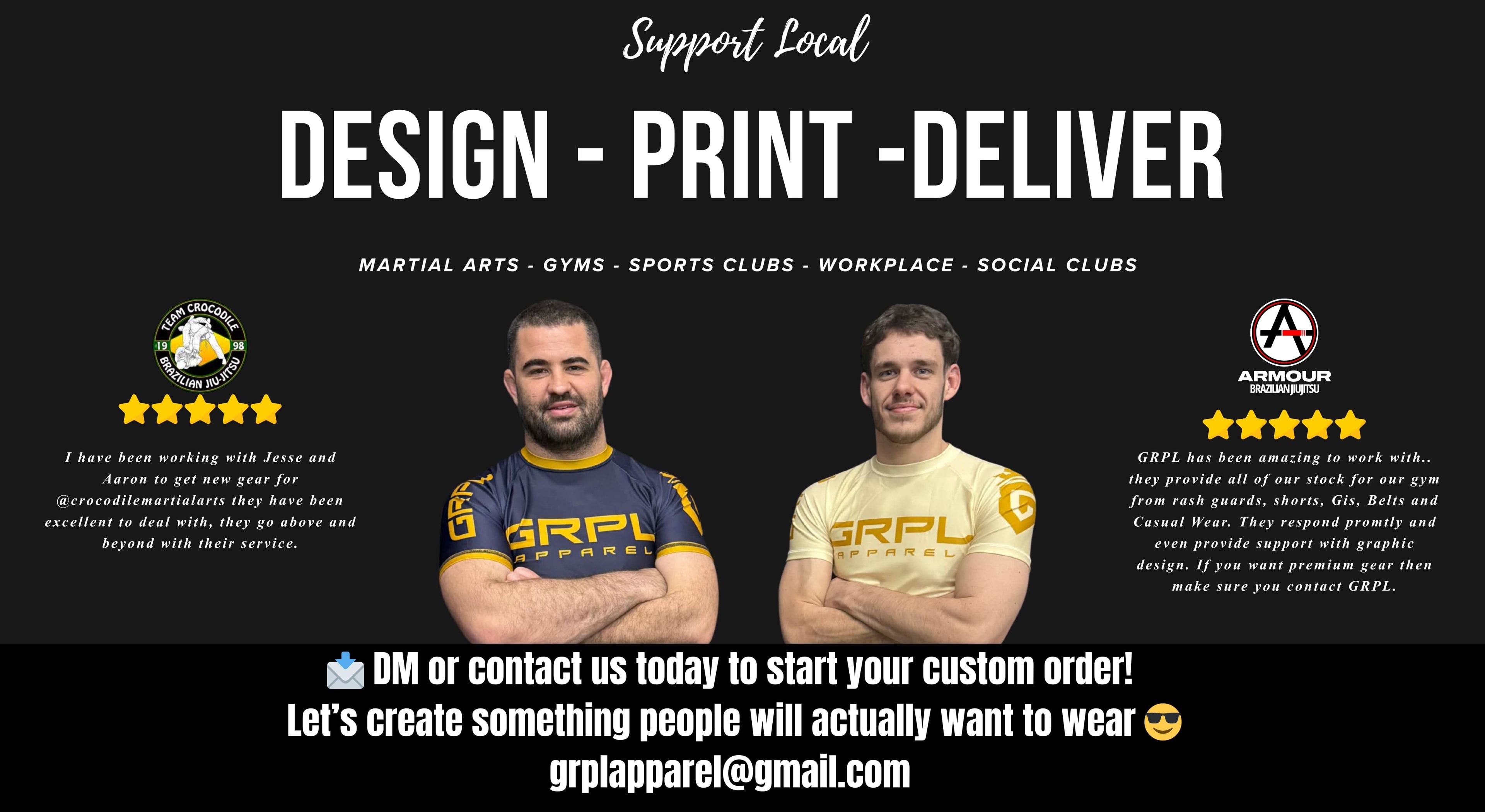GRPL Apparel offers fully customisable Rash guards, shorts, Gi's, and other fight gear with your gym’s branding — no setup fees, low minimums, and pro-level quality your members will love.