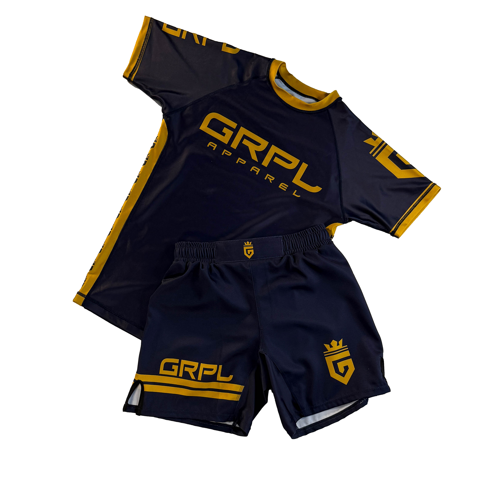 Forged in pressure, built for endurance. The Royal Dusk embodies focus and resilience — a deep navy and gold contrast that reflects strength through simplicity. Durable stretch fabric, reinforced seams, and a competition-cut fit made to move with purpose.